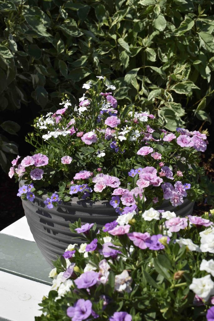 Patio containers are a lot more exciting these days than in the 80s! Not only are the pots themselves more varied and attractive, the choice of plants is vast. In addition to new forms of all the old favourites such as petunias and marigolds, there are diascias, nemesias, bacopa and callibrachoas (above) which we had never heard of twenty years ago.