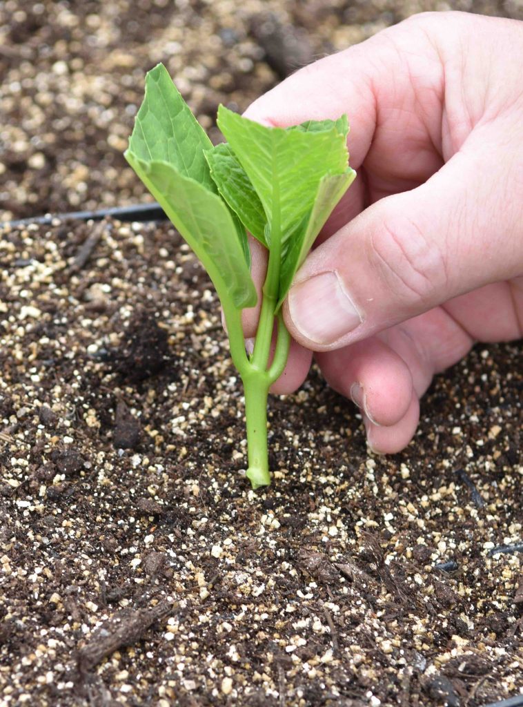 Hydrangeas are easy to root. But the leaves are large and cuttings can wilt so it is usual to cut across the leaves to reduce their surface area. They root quickly and the plants should be kept cool but free from frost over winter.
