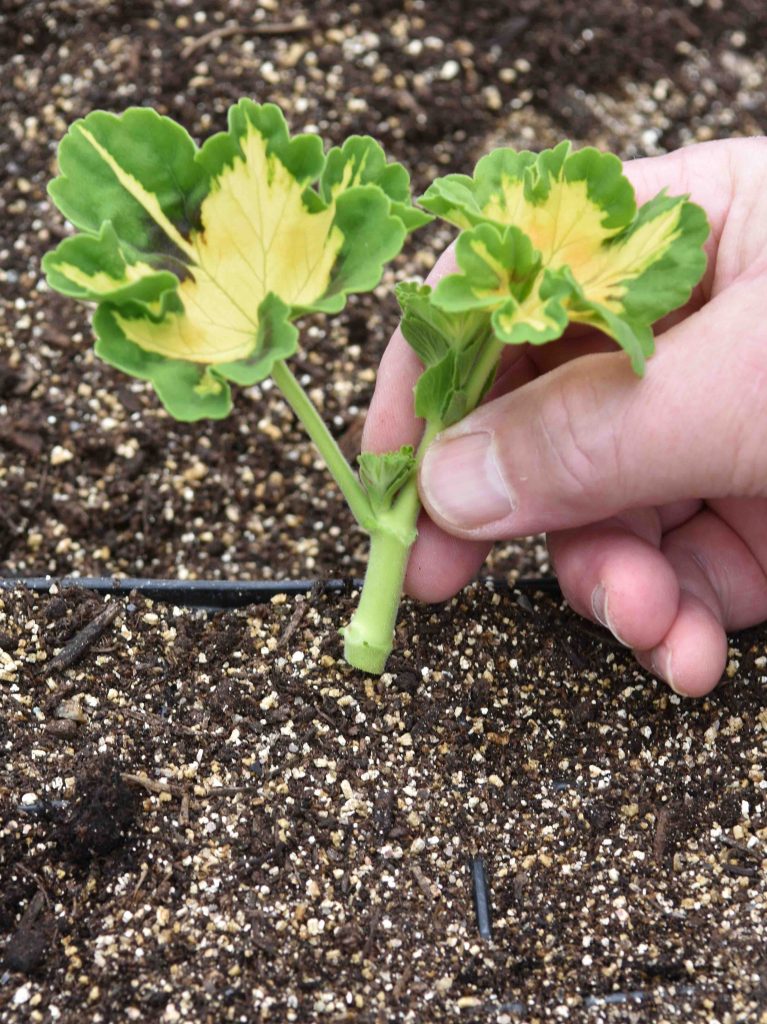 There are fancier and newer plants but I still rely on pelargoniums (often, wrongly, called geraniums) for summer colour and they are easy to root. But they do break a few rules and the cuttings can be allowed to wilt slightly and it is best NOT to use rooting hormone. Trim the lower leaves off, remove any flower buds and remove the leaflike stipules from the stems – see photo above. After putting them in the compost, water well but do not keep the leaves wet all the time by misting. This will lead to rot. They will root in about a month and then need to be kept cool and bright over winter but away from frost. You can pot them up in spring.