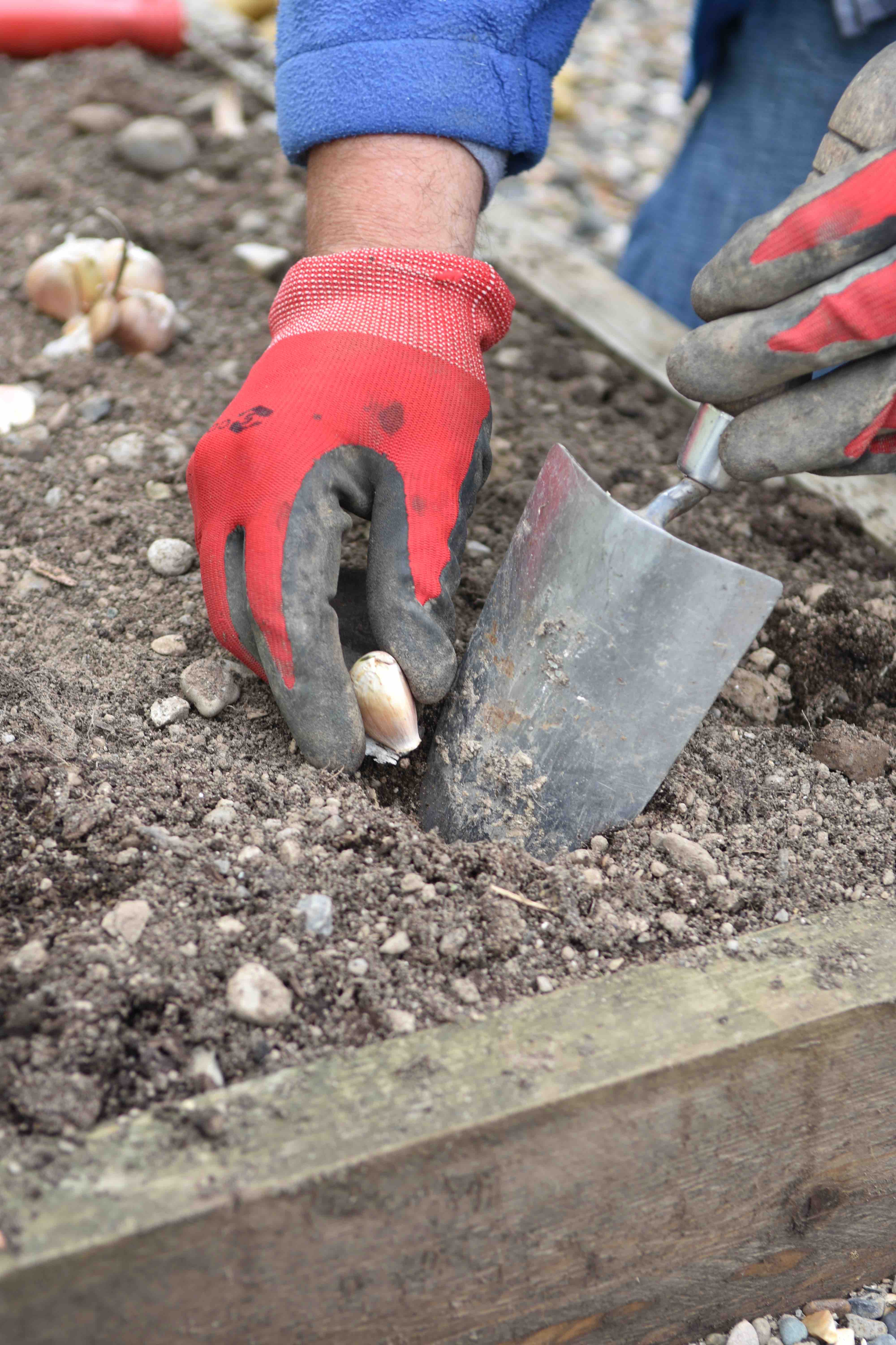 Prepare the soil by forking it over and remove any weeds. Then pull the bulb apart to separate the cloves and plant these about 15cm apart, with rows 30cm apart. Do not push the cloves into the soil but use a trowel so the tops (the pointed end) are about 1cm deep. There is no need to water, at this time of year and all you need to do is keep the weeds under control. Leaves should soon appear and remain over winter.
