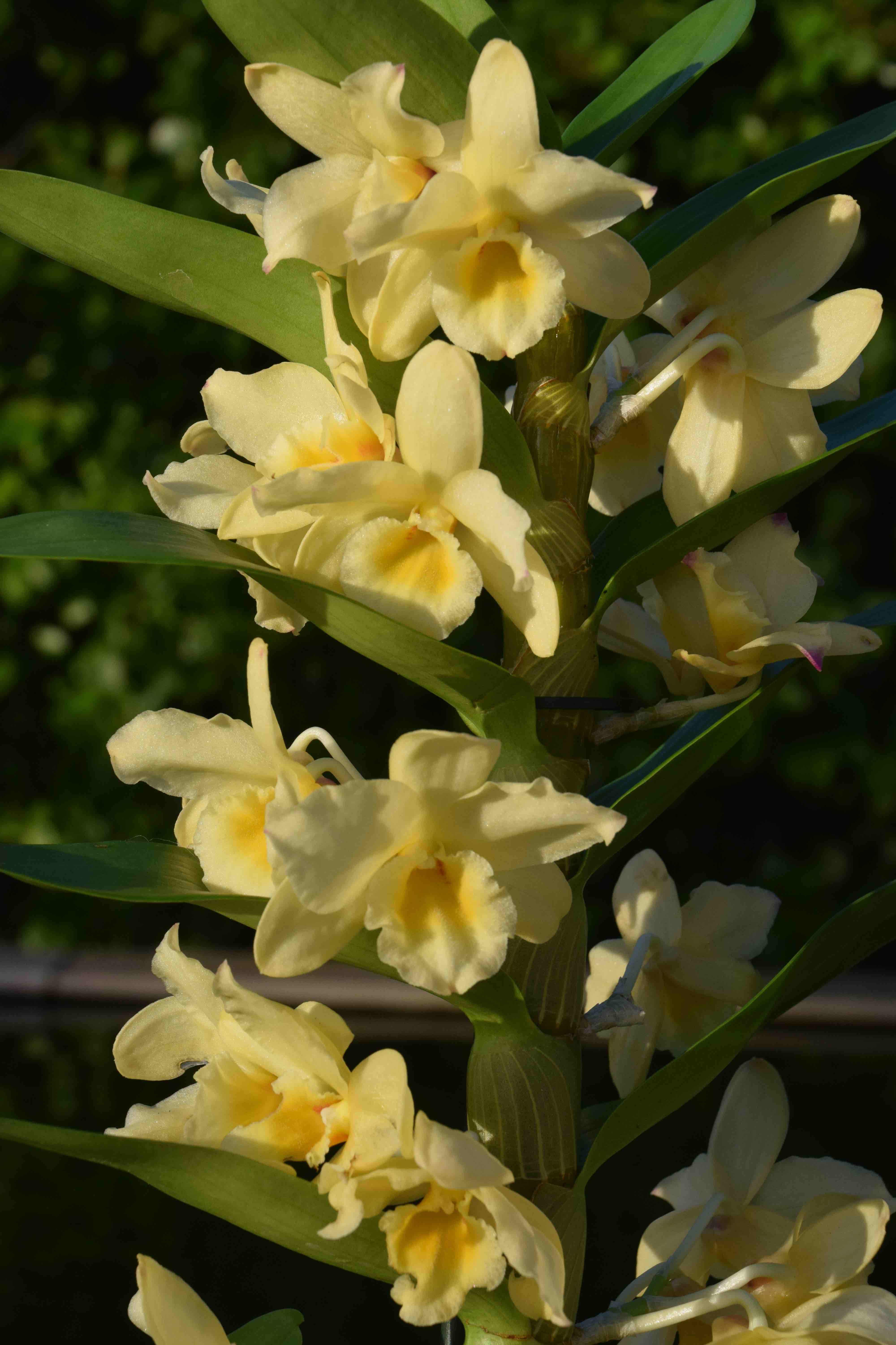 You will probably find dendrobium orchids (Dendrobium nobile) for sale now too. These are usually mauve and white or white but there are also yellow kinds. These form upright stems with leaves in two rows, rather like ladder rungs and there is a small cluster of blooms at each leaf. These like a cool room too (above 10c) and when all the flowers drop off you should cut off the stems. New growths appear from the base and grow all summer and will bloom next year.