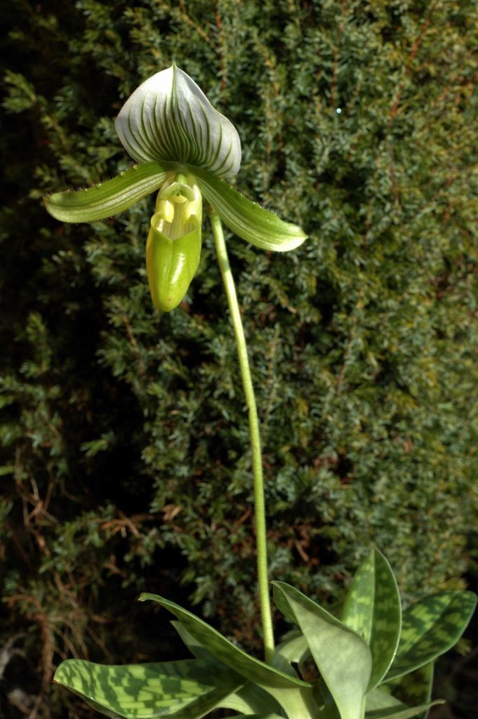 Slipper orchids (paphiopedlium) are very strange and produce one, or a few, large flowers on each stem above plain green or mottled leaves. Each flower will last several months and the plants are attractive even when not in bloom. A bright spot, out of direct sunlight, and a temperature of 15-20c is suitable.