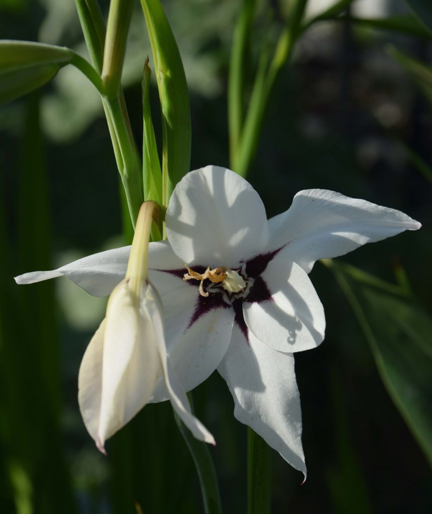 I can’t leave the subject of gladioli without mentioning one of my favourite summer bulbs and possibly my favourite flower fragrance of the year! Look out for packs of Gladiolus murielae, also known as Acidanthera or the Abyssinian gladiolus. Basically a very slender gladiolus, this produces elegant, swan-necked, flowers of pure white, each with a chocolate blotch, in September. It likes sun and warmth and needs a fairly long growing season so I always start them in 15-18cm pots, packing ten in each, about 5cm deep. I start them into growth in early March so they are already 15cm high when I plant them in the border, as a clump, in mid May. You can plant them direct in the garden too, in late March or April but they will flower slightly later. I also grow a pot in the greenhouse and bring them into the house when in bloom so I can really enjoy their perfume. The flowers are most fragrant in the evening and, while the perfume is difficult to describe, it reminds me of ‘Ambre Solaire’ sun cream so a sniff takes me back to summer holidays of my youth. The plants grow to about 1m high and are good for cutting too.