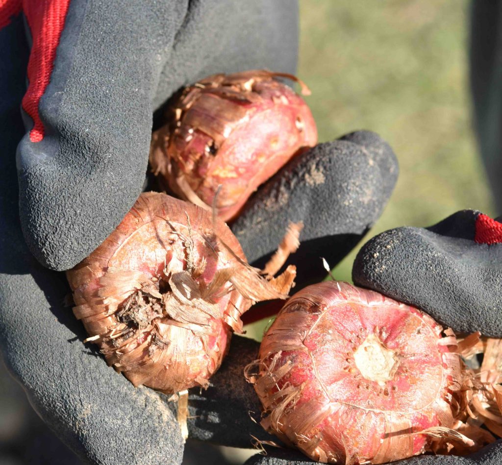 Gladioli are not reliably hardy so they are usually lifted and stored in winter. Gladioli grow from corms and these are slightly odd in that the corm you plant shrivels up and is replaced with a new one on top, as well as masses of small cormlets. If you lift them in autumn you can clean them and keep just the healthy new corms and discard the small cormlets that you won’t need. But we are getting ahead of ourselves a bit here. Let’s go back to your visit to Nag’s Hall and your purchase of new gladioli corms.