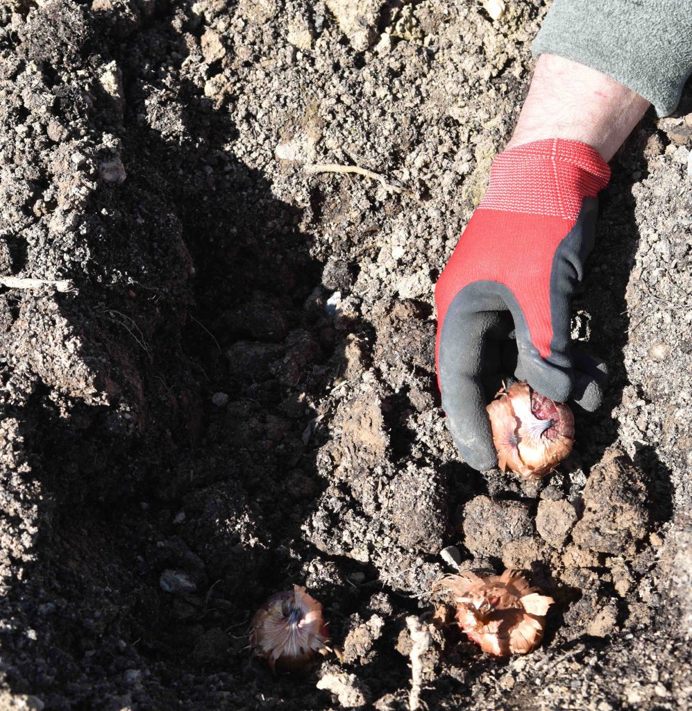 You can plant them in a row in the veg garden or in a clump in the border. Plant them about 10cm apart and 8-10cm deep.