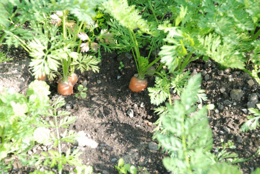 Carrots These can be tricky to grow in the soil and have various pests, but they are easy to grow in large pots of compost. They grow slowly so sow some radishes along with them so you can enjoy the radishes and then leave room for the carrots to develop.