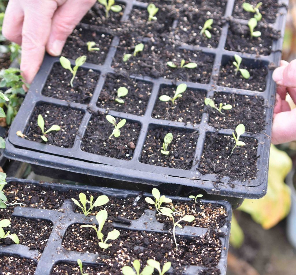 Once they are big enough to handle, carefully transplant them into cell trays and grow on in cool, bright conditions.