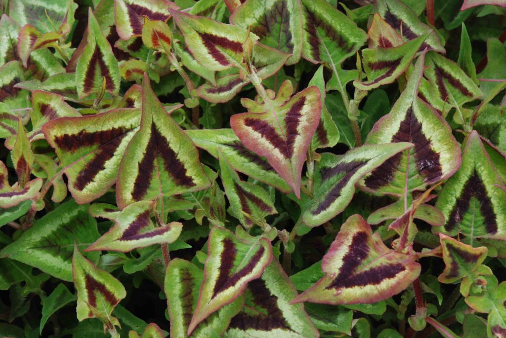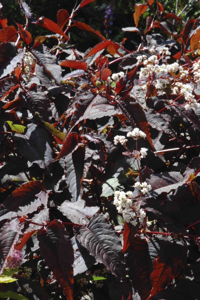Grown more for foliage than flowers is ‘Red Dragon’ with reddish leaves. It can look straggly in a pot when you buy it but when planted out forms a rounded mound of beetroot red leaves with rather insignificant ‘popcorn’ flowers. It is a great filler and does not spread.