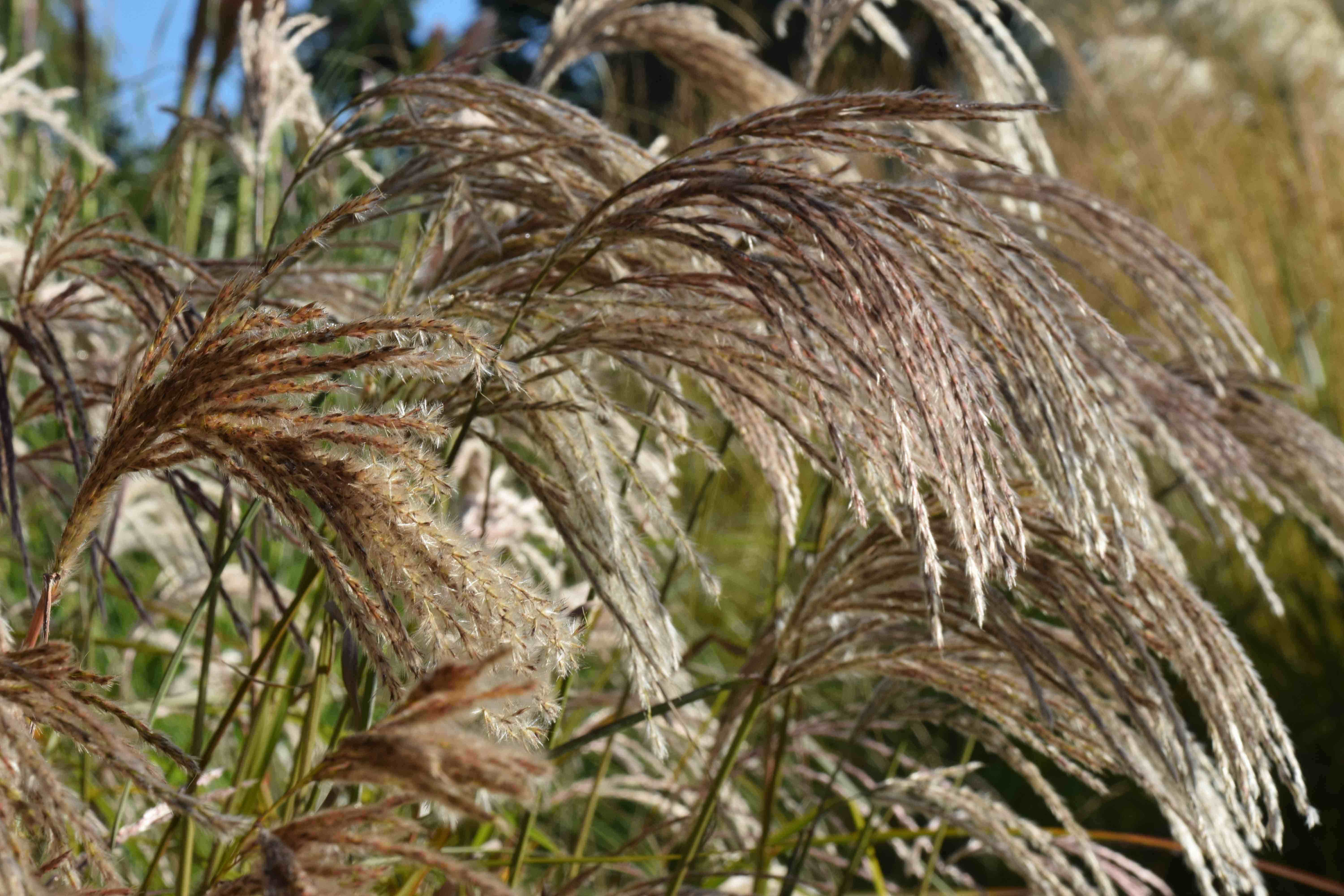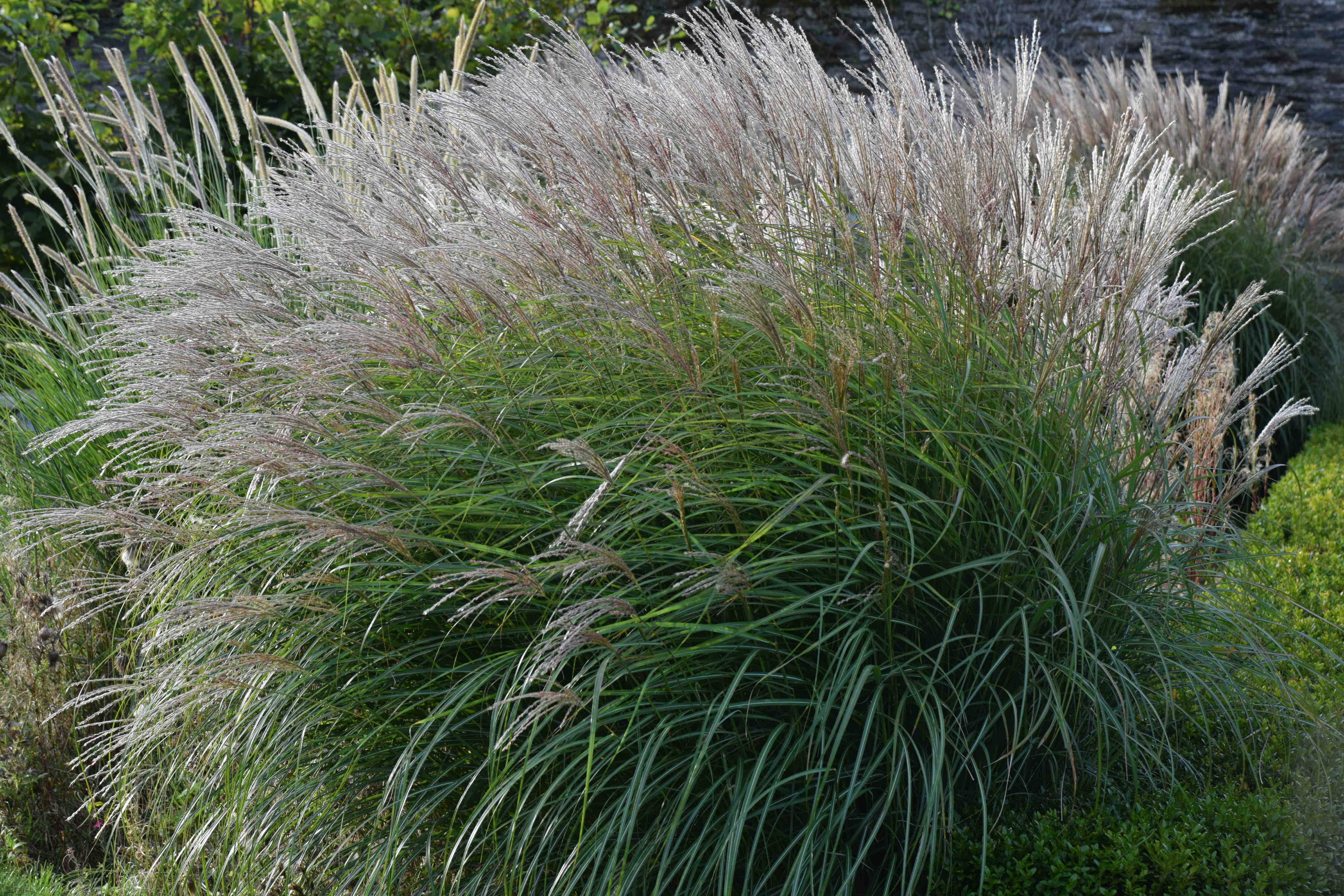 Miscanthus are hardy, clump-forming grasses. They send up leafy shoots that reach their full height by late summer and they usually end in a fluffy, feathery flowerhead that is often red or tinged with red at first but ages to silver or gold. Some have variegated leaves. Their height varies from 1m to 2.4m or more. The taller kinds are great for screening but they turn brown in autumn and must be cut down in late February or March. Unlike bamboos, these will not spread but they won’t offer a screen all year. Their garden appeal is the great fountains of foliage in summer and the often spectacular flowers in autumn. As such they are much better garden plants than pampas grass.