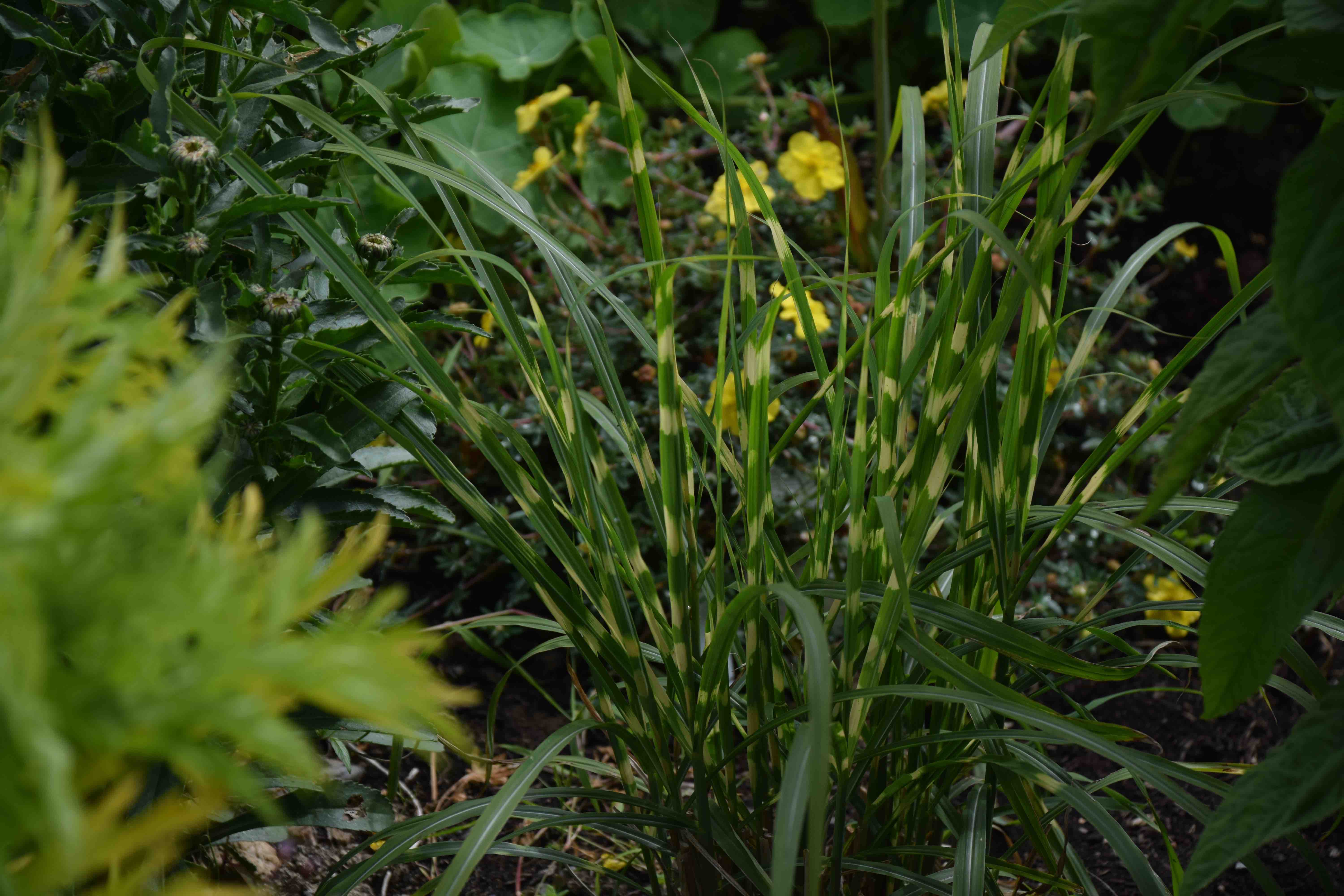 There are several with a rather strange variegated pattern with transverse stripes on the leaves. ‘Zebrinus’ is the most common and ‘Little Zebra’ is a smaller form, only reaching 1.2m. I now have the latter and although it can produce pinkish flowers, mine rarely does. In theory I think the plant is rather ‘tacky’ but I actually like it and the fact that I have divided it and now have six clumps says more than words can!
