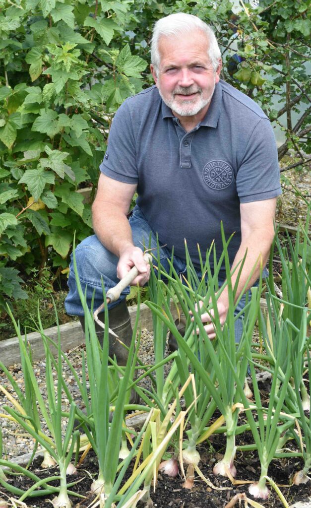 This is the worst of the onion diseases and is present in the soil. Once it appears you cannot grow onions in the soil for at least five years. The plants ‘die’ and go yellow prematurely and the base of the bulb rots. If the onions do form then they can sometimes be rescued but they will not store. I have a series of raised beds so this bed will not be used for onions, or related crops, for many years. I am not sure how it got into the garden since growing from seed should ensure it is not brought in. But the wet weather certainly has not helped. I am pulling them up where affected and will bend over the tops of the healthy onions to speed up ripening.