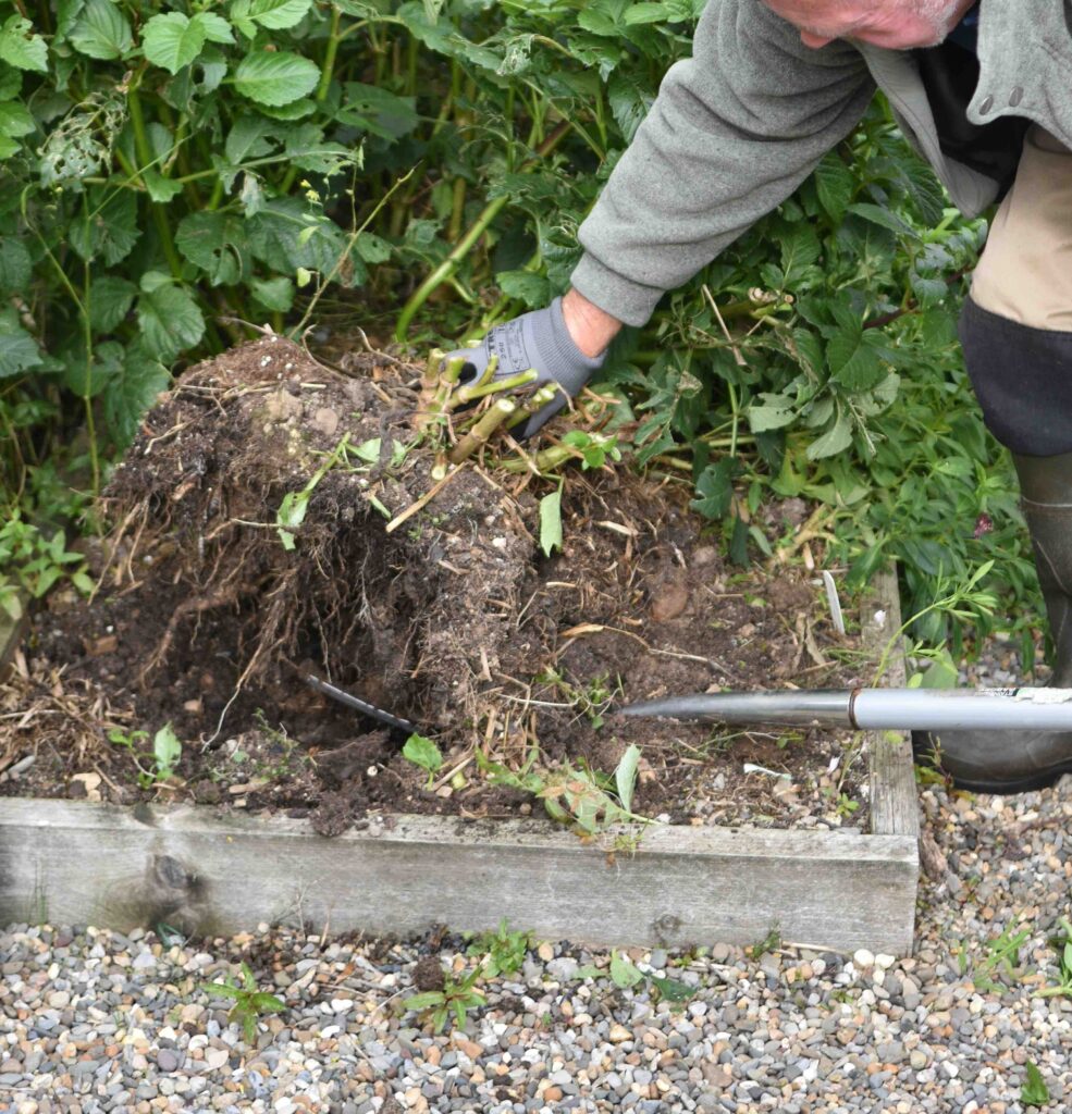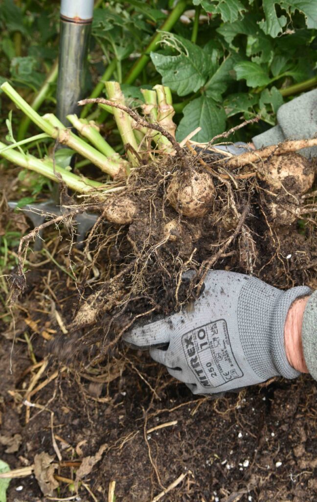 You then need to dig up the tubers. You will find that the tubers are huge compared to what you planted! So push in a fork well away from the stems and lift the tuber carefully to avoid damaging the individual roots.