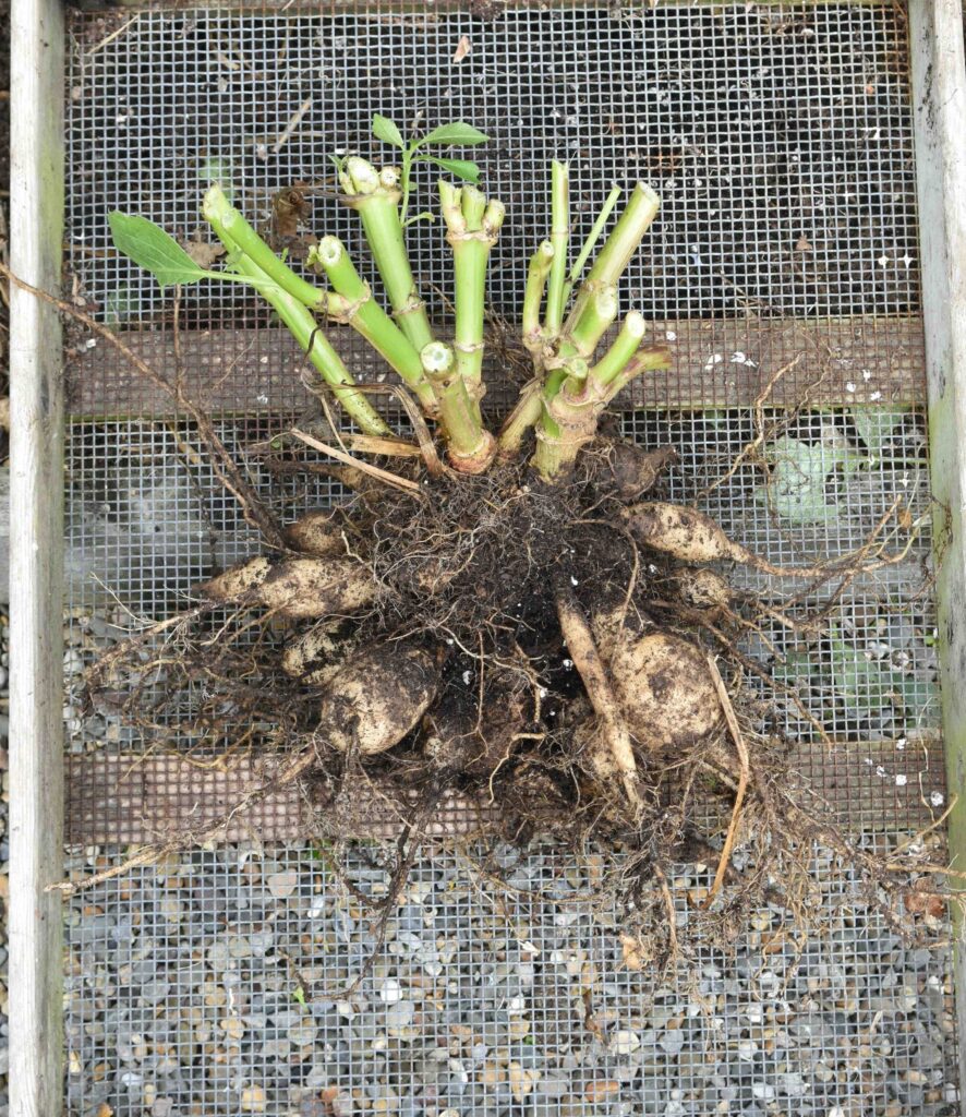 Dahlias are not truly hardy – if the growths or the tubers are frozen they will die. The active part of the tuber, where new shoots grow, is at the base of the old stems, at the top of the tuber. If winter frost reaches these areas the plants will be killed. You therefore have two options: you can leave the tubers in the ground or you can lift them and protect them.