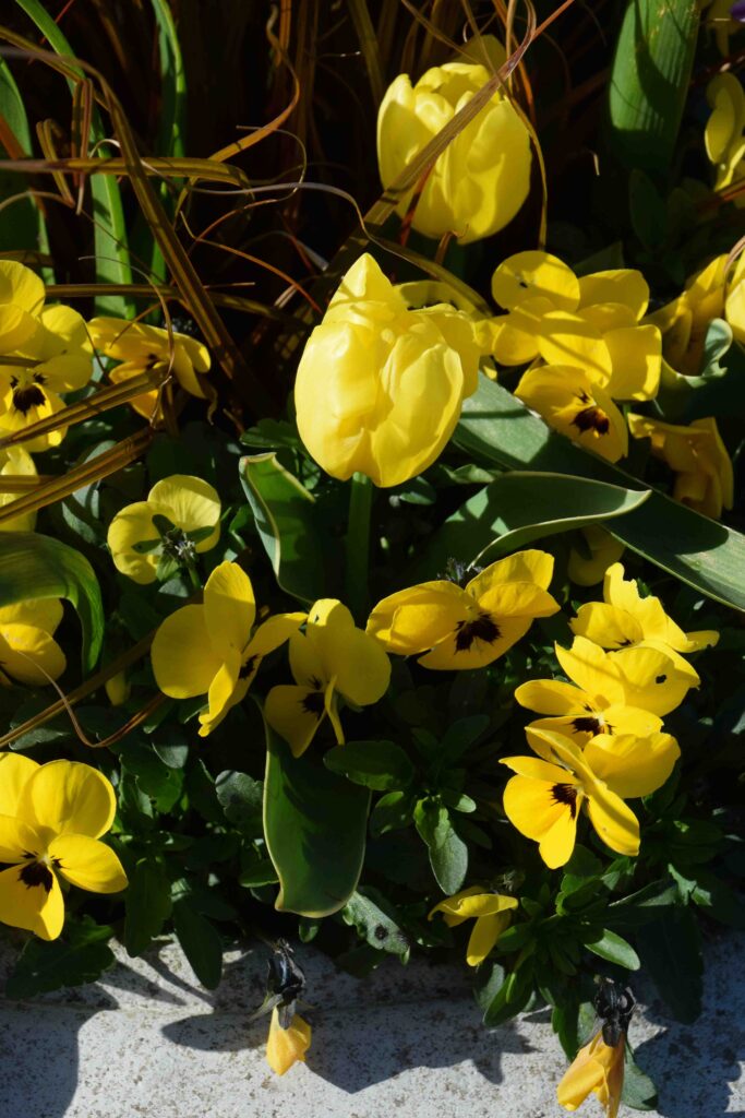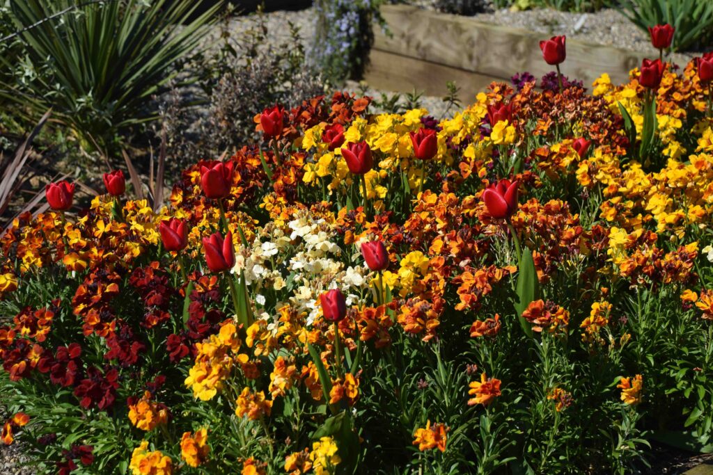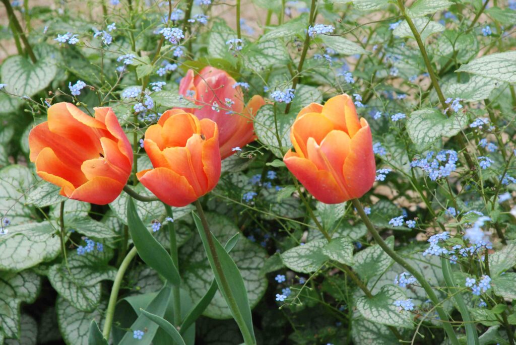 The traditional way to grow tulips is to interplant them in beds with wallflowers, violas or forget-me-nots. We have the Victorians to thank for this and it is a great way to use them. Always put in the plants first and then the tulips. If you put in the tulips first you may damage the bulbs when you put in your wallflowers or (as above) forget-me-nots.