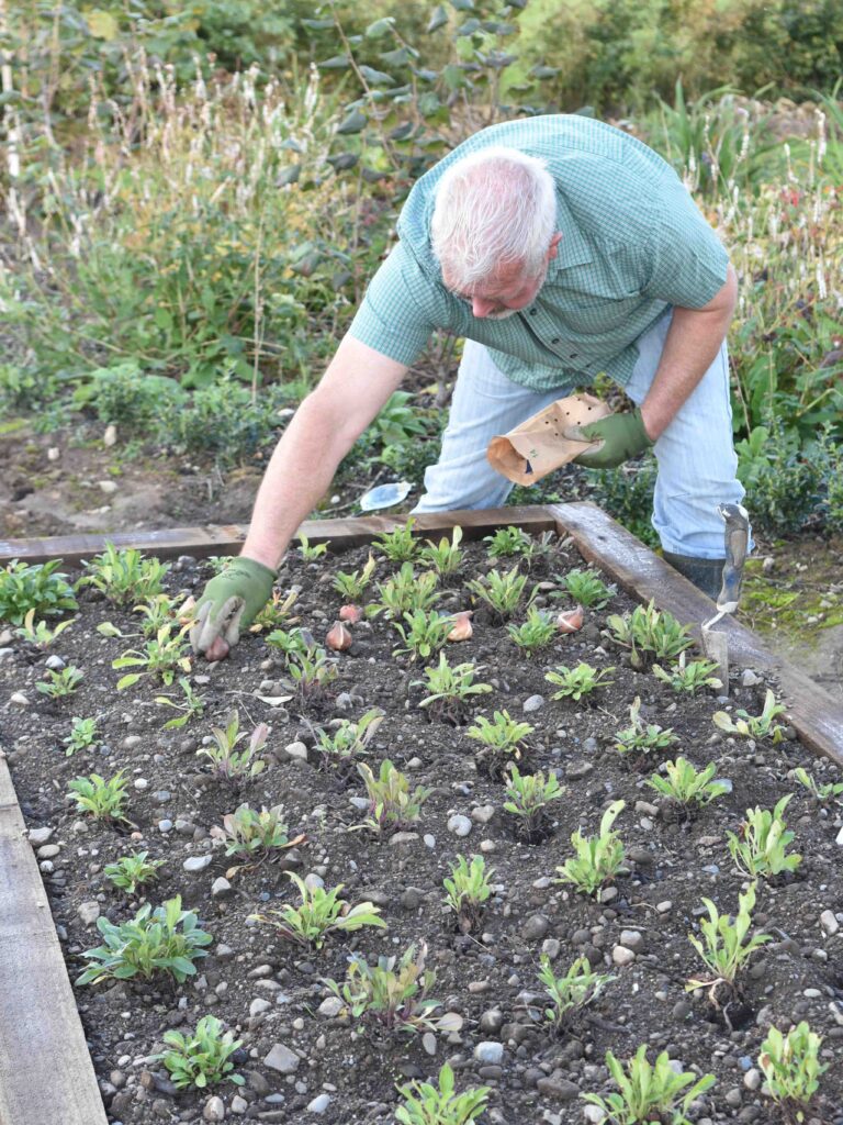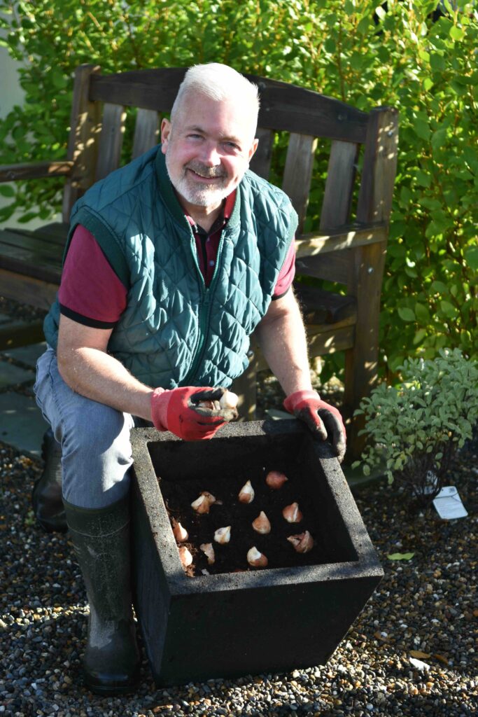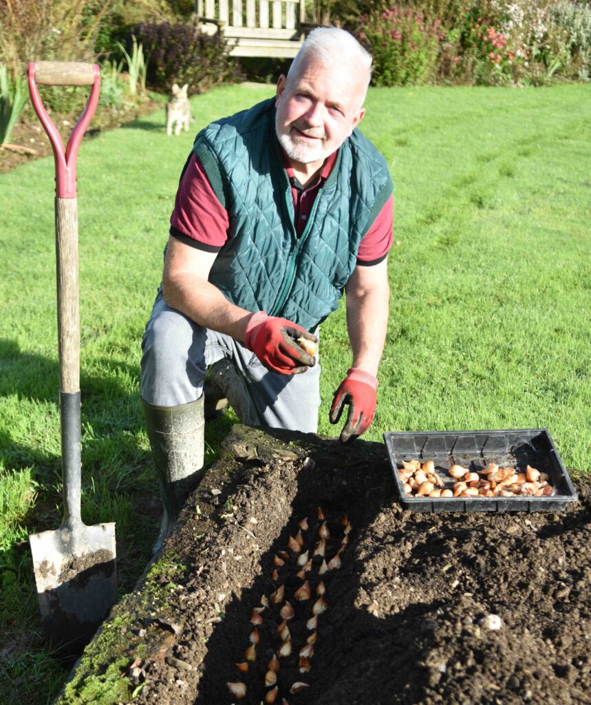 If you have been hesitating about planting bulbs for spring, now is the time to act. It is really rather late for small bulbs and daffodils – they will grow but you need to rush. But it is the perfect time to plant tulips. The photo above is me planting all the smaller bulbs of special tulips that I have saved from this spring break. I plant them close and most will bloom, but this is a bit closer than usual – it is just a nursery for all my tulips and they will produce some larger bulbs to lift next June. Mia in the background is making sure I do it correctly!