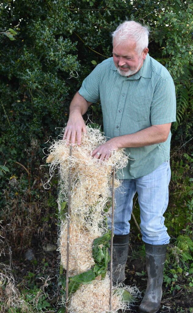 Plants outside in the garden need protection too. When frost kills alstroemerias to the ground you can apply a loose mulch of bark or compost. Agapanthus are generally hardy but the evergreen kinds, that have the largest flowers, benefit from protection in very cold periods. Never use plastic to protect plants because it will encourage rot. You can loosely cover the plants with straw, bracken or a loose cover of fleece but remove them when the weather is not frosty. I protect my hardy bananas with a cage of chicken wire filled with leaves, straw or, in the case below, some wood wool I had as packing material. Cut the leaves off the top of the ‘trunk’ and put some plastic over the top to keep out water – please note it is only as a cap on the cylinder and NOT wrapped around the whole plant.