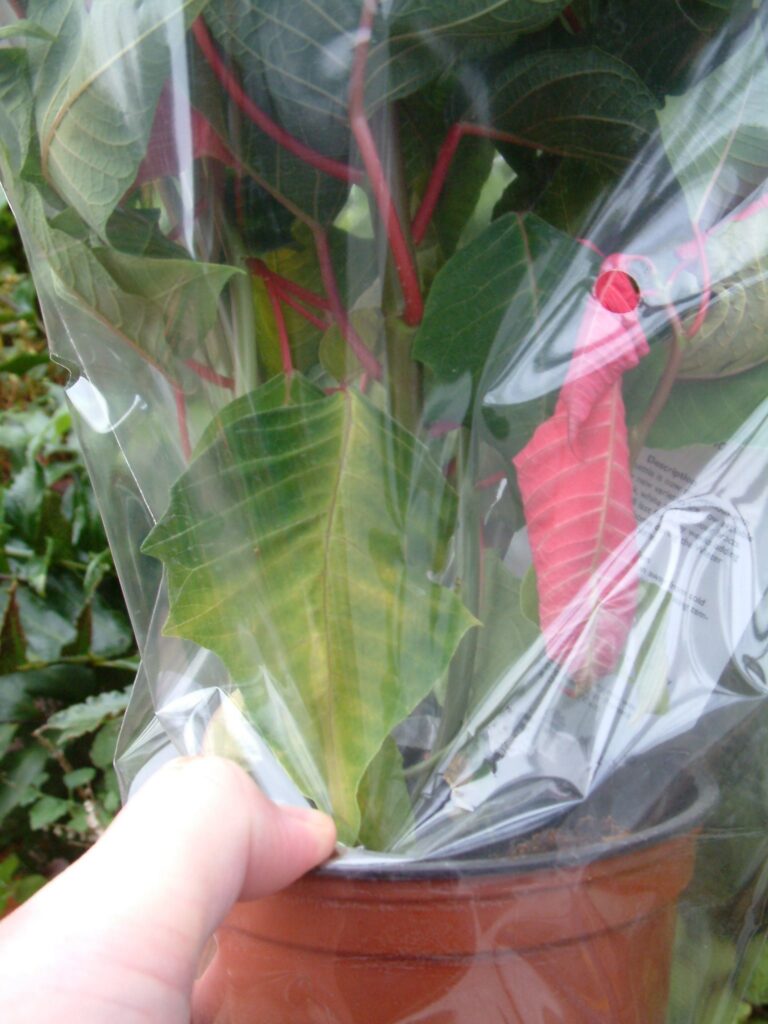 If it is in a plastic sleeve (good to prevent damage to the leaves and bracts in transit) check there are no yellow leaves or fallen leaves or mouldy leaves in the base – signs that the plant is old or has been badly looked after.