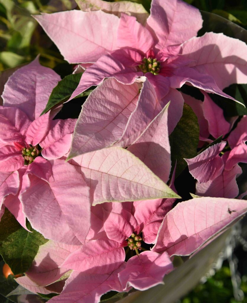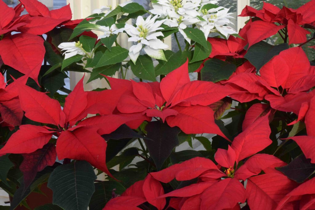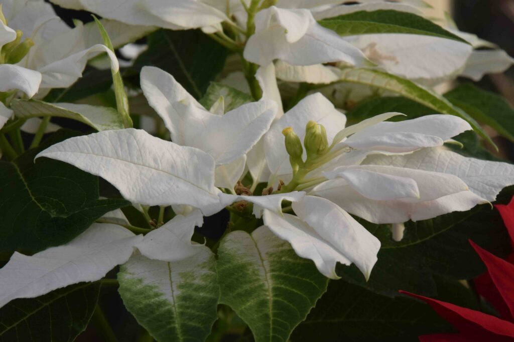 The bracts can last many months but the small yellow flowers open and drop off. Look for tight clusters of the yellow flowers – any plant with a gap in the centre, is older and may not look as fresh – as you can see on the white poinsettia below.
