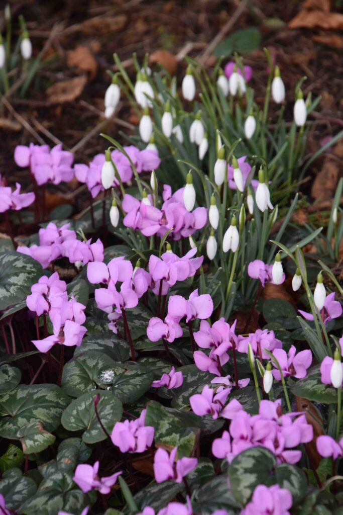 Autumn-blooming Cyclamen hederifolium is also a perfect plant to combine with snowdrops. The flowers appear in August and the foliage is present all winter, marking where the snowdrops are planted so you do not accidentally disturb the bulbs.
