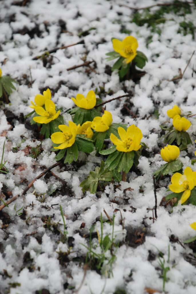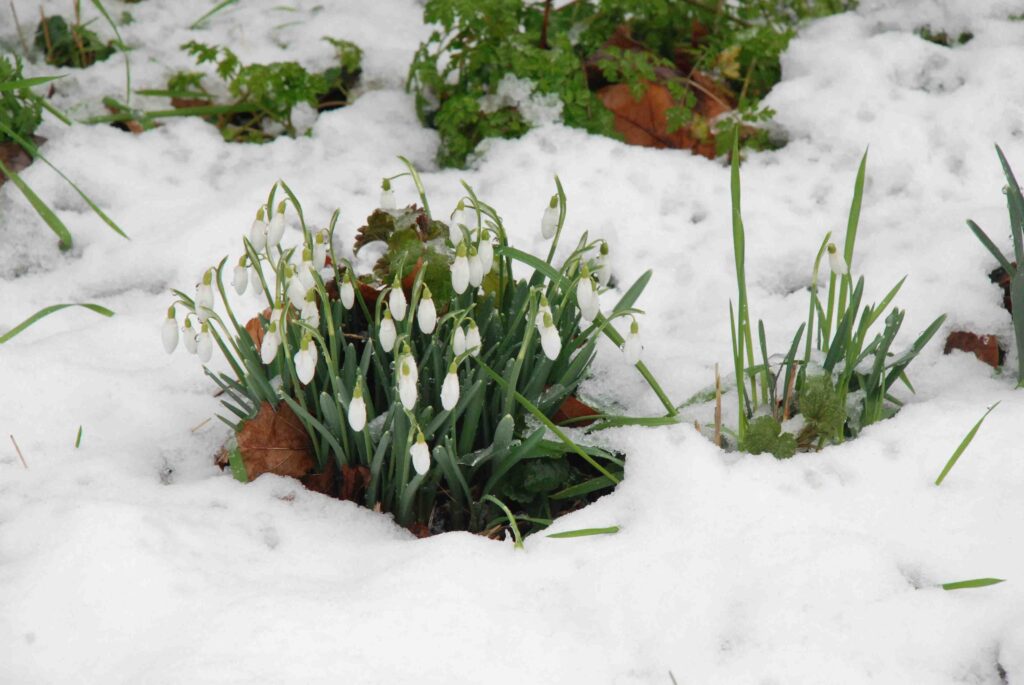 Snowdrops look good when piercing through fallen leaves (or snow) or a cover of ajuga or other low plants. A classic companion is winter aconite with cheerful yellow flowers. These are best divided and planted after flowering too and you can buy these and other plants, in pots, at Nags Hall now.