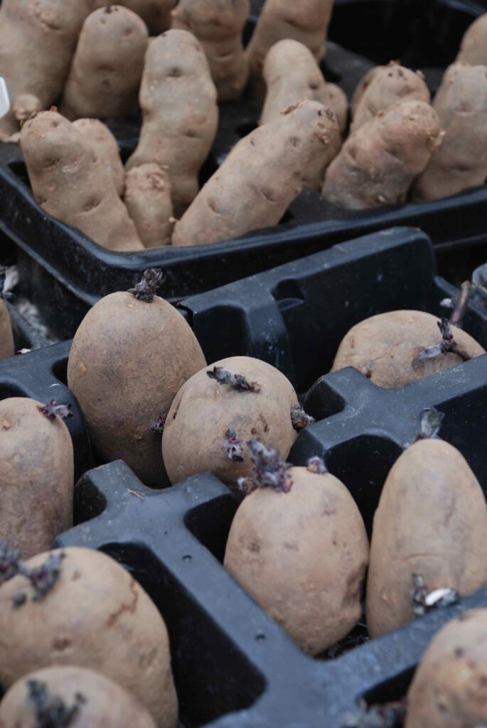 In all cases you need to chit them, to encourage the tubers to form short, stubby shoots before planting. This encourages heavier and earlier crops. Take your potato and you will see one end is where it was attached to the stem and the opposite end has the most ‘eyes’. This is the ‘rose’ end and you place the tubers, rose-end-up, in a tray or egg box and put them in light, in a cool but frost-free spot to sprout. After a month or so, they should be sprouted and ready to plant.