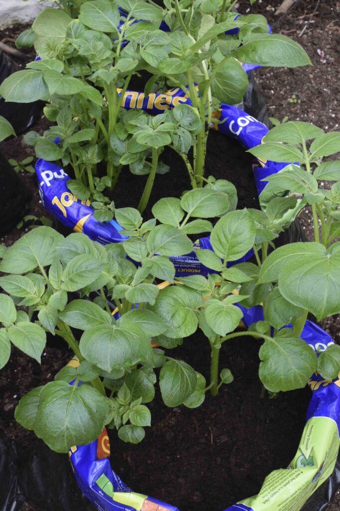 Frost kills potato foliage so, in the garden, when the shoots start to push through the soil, rake soil over them. This protects them from frost and also increases the depth of soil over the plants which increases the crop (the tubers form on the stems and not on the roots) and also covers developing tubers from light, to prevent them turning green.