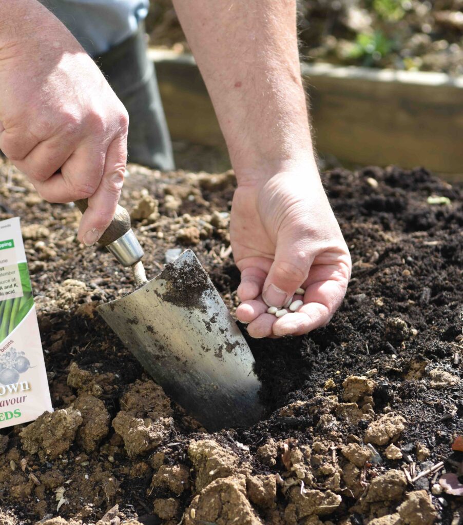 With dwarf kinds, sow two seeds per station, about 15-20cm apart in rows.