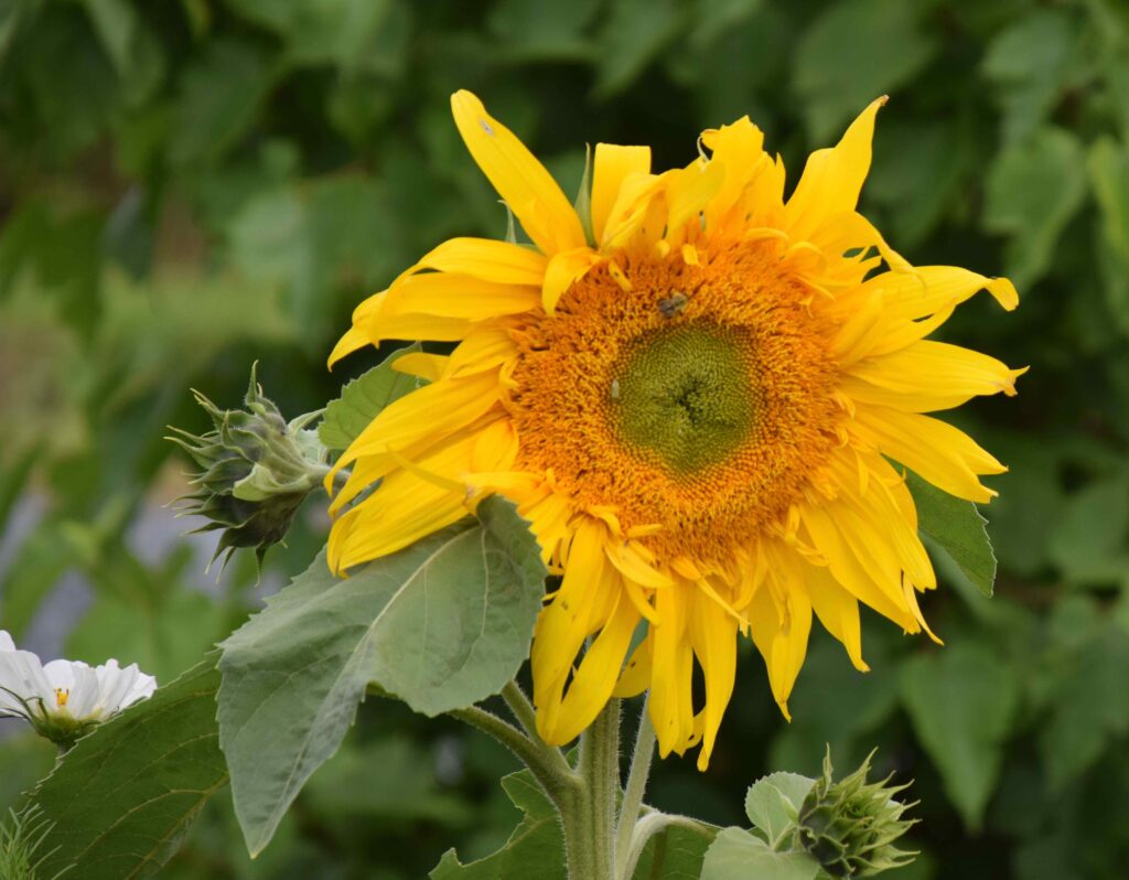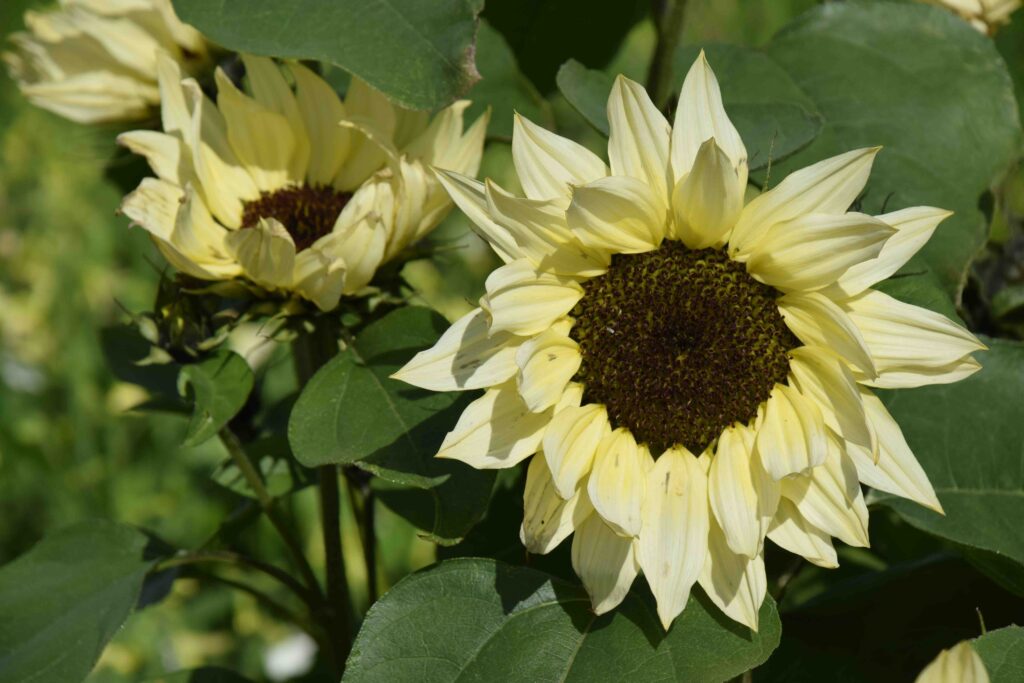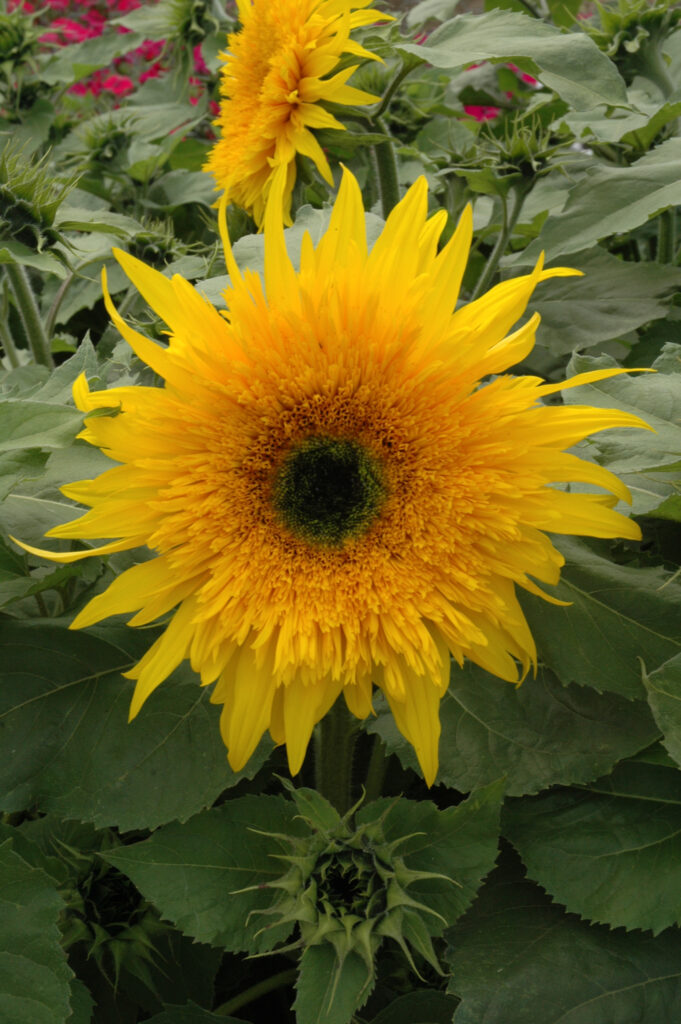 When buying your seeds also look to see if they are going to grow one main flower or whether they will branch and form several flowers at the top of the stems. When sunflowers are grown commercially as cut flowers they are grown close together so they only produce one flower per stem and then the whole plant is cut. But if you want a plant with lots of flowers or if you want tall plants you will need to give them room to grow! For giant plants that reach more than 2m high you need to give the plants lots of room – possibly 1m apart. For most others you need to plant them 60cm apart – these are large, leafy plants.